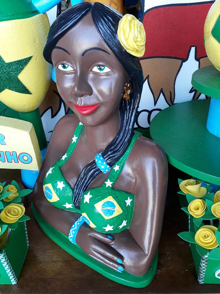O enfeite preferido da Artista Plástica Bel Godinho é a namoradeira de gesso pintada no estilo brasileiro, morena e com roupa estampada com bandeirinhas do Brasil.